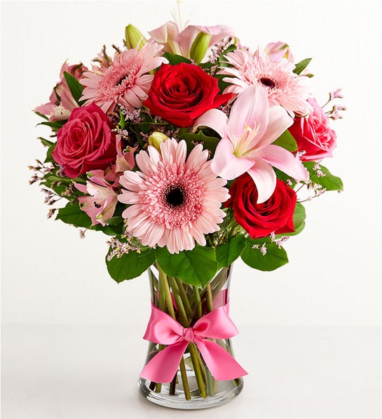 Inspired by the rich beauty of the European countryside, our romantic bouquet reveals all the feelings you have in your heart. Fresh-picked pink & red blooms are on display inside a glass vase finished with ribbon, creating a timeless gift for someone you love.